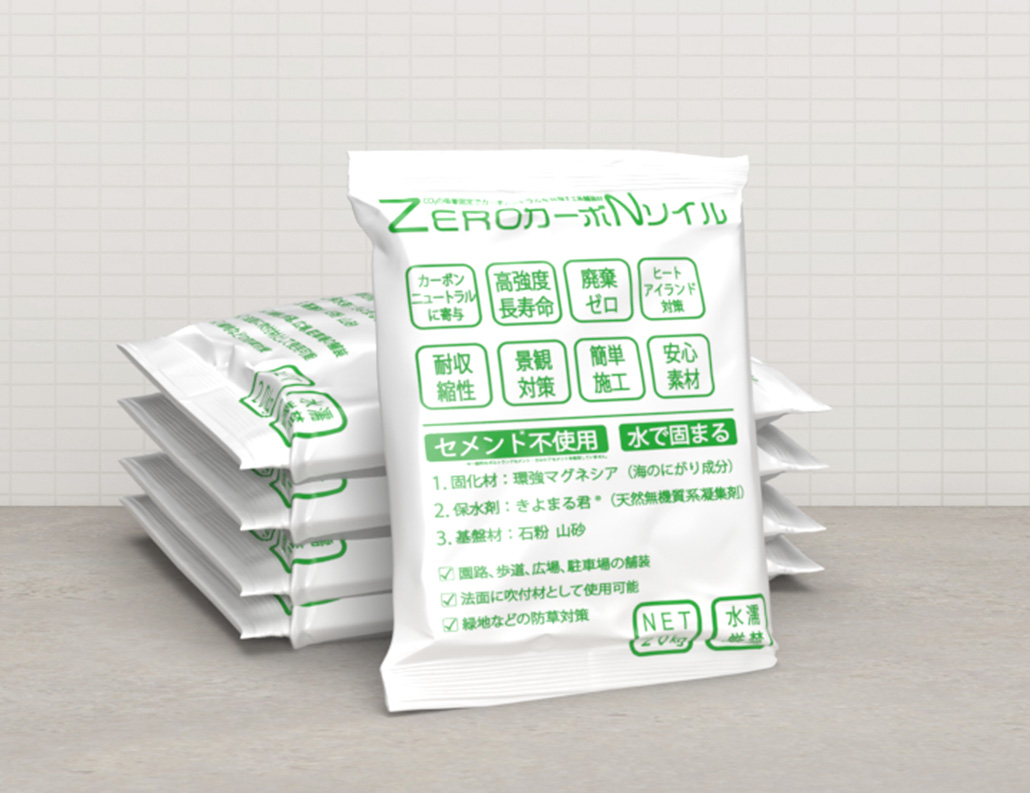 "Zero Carbon Soil"This is a low-carbon soil pavement material premixed at the factory. It consists of high-quality sand, clay, and recycled sand, combined with a special high-strength magnesium oxide-based solidifying agent extracted from natural seawater, and a natural inorganic flocculant ("Kiyomaru-kun") made from Shirasu (volcanic ash)."