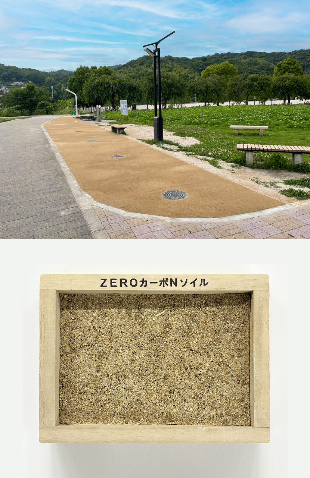 "Zero Carbon Soil" is a low-carbon soil pavement material that adsorbs and immobilizes CO₂. This product is pre-mixed with cement-free, naturally derived, and safe materials. It solidifies with the natural texture of soil simply by spreading, leveling, and watering.